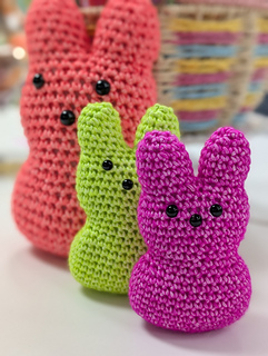 These adorable little Peeps Bunnies are just the thing to grace the Easter basket of your favorite kiddo! This classic beginner crochet pattern has been reworked to be even more beginner friendly. This easy to follow pattern does not use a magic ring, and instead has an oval base, made by working down one side of your foundation chain, around the end, then up the opposite side. Once the initial round is established, you’ll work around the oval (without turning or flipping) with increases and decreases worked on each end for the shaping. You will work the entire project in a spiral, without joining rounds with a slipped stitch or a chain 1.
