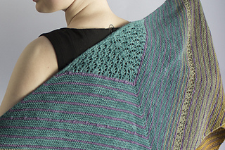 Knitting begins at shawl center with Emily Ocker’s cast-on. Lace is worked flat, increasing outwards to form a symmetrical triangle. Garter stitch begins while increasing continues.