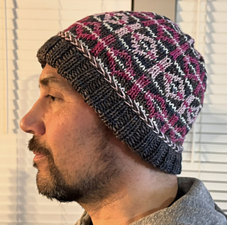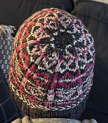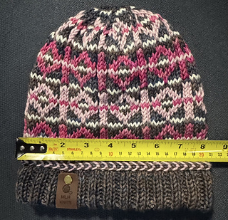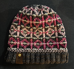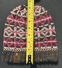 This pattern includes a chart for the body of the hat. The example hat used 15-20 yds of the Ivory yarn, 100-110 yds of the Brown, and 25-20 yds of each of the Light Pink + Hot Pink yarns.
