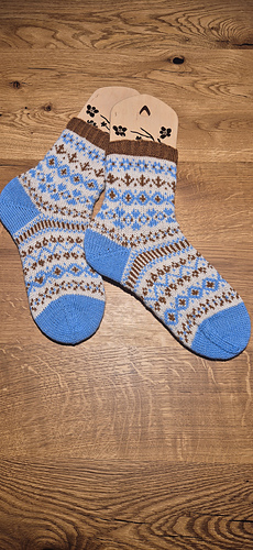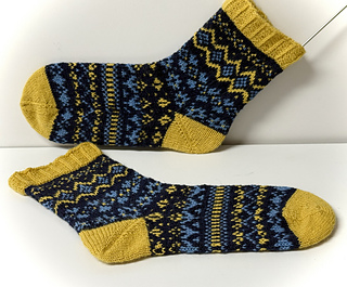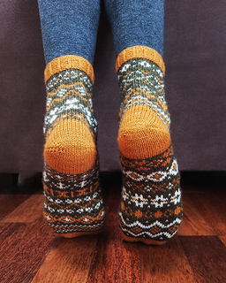The sample socks were made with Sock Merino Woollala, MC Mr Darcy, CC1 Golden Honey and CC2 Pudding