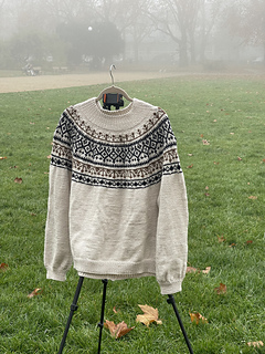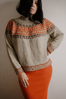 Żakardowy pulower z okrągłym karczkiem przedstawiającym wzór inspirowany pereborami – czyli ornamentami tkackimi charakterystycznymi dla wschodnich regionów Polski. Włóczka grubości sport i swobodny krój sprawiają, że sweter jest wygodny i ciepły, a jednocześnie lekki. Sweter jest wykonywany od góry, bezszwowo w okrążeniach, co pozwala na łatwe dopasowanie długości tułowia i rękawów. Żakardowy motyw występuje także w plisach, którymi wykończony jest tułów i rękawy, czym nawiązuje do tradycyjnych koszul zdobionych pereborami.