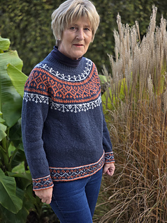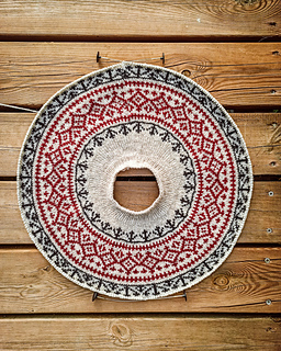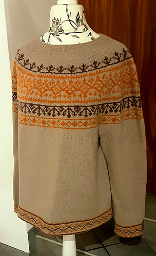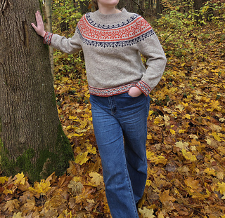 Circular needles, 60-120 cm / 24-47”: 3.5 mm (US 4) for ribbing; 4 mm US 6 for stockinette stitch and colorwork in the hem; and 4.5 mm US 7 for colorwork in yoke (or other size to obtain gauge)