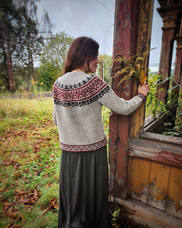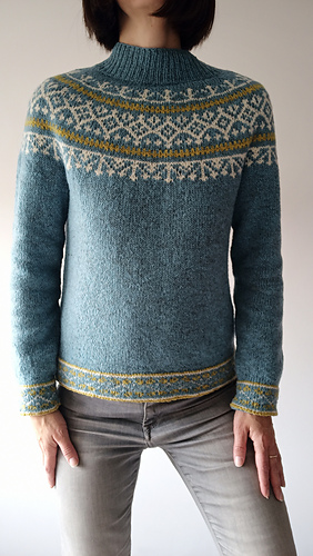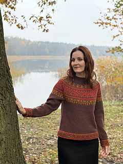 Perebory Sweater is a colorwork pullover with a circular yoke featuring a geometric pattern, inspired by perebory – weaving ornaments characteristic for the eastern parts of Poland. Thanks to sport weight yarn and relaxed fit it is comfortable and warm and at the same time light. The sweater is worked top down in the round, seamless, allowing for easy adjustment of the length. The body and sleeves are finished with colorwork hems reminiscent of traditional shirts decorated with perebory.