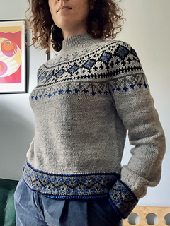 Featured sweater was knitted with Cautiva from Wooldreamers in Gris Natural (MC), 050 (CC1) and 652 (CC2) colorways.