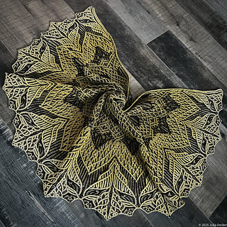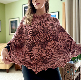 This shawl is recommended for those who already have some experience with two-color brioche. This is a challenging, intricate knit that incorporates a number of advanced techniques. A combination of brioche lace, brioche star stitches, brioche cables, and brioche syncopation are used to create this beautiful original design.