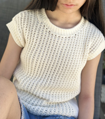 The technical features of this top include: shaped drop shoulders, carefully finished edges and seams, a beautiful round U-neckline, and ribbed neck and sleeve edging worked vertically, in the round, with an invisible seam.