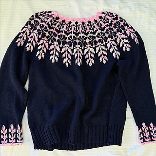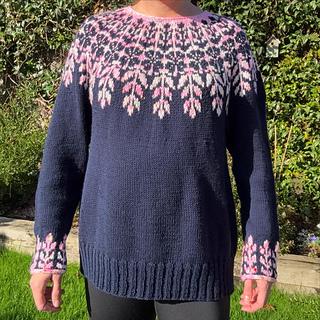 The colourwork yoke is knit using the stranded/fair isle method. You can then add optional short rows for a better fit. The armhole stitches are set aside for the sleeves to be knit later. The body is then completed with a ribbed edge.