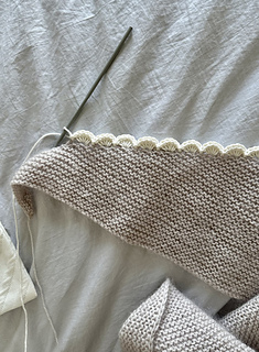 Sample is knitted with Knitting for Olive Merino, colour Marzipan, together with Majo Garn Pearl Mohair color Organdy. The scalloped edge is knitted with Mode by Rowan Cotton DK, colour Macaroon.