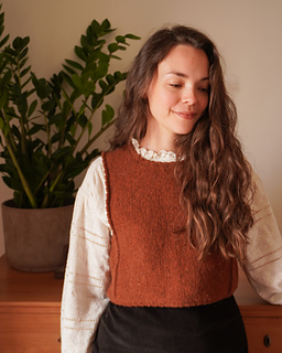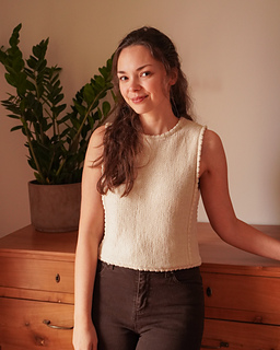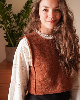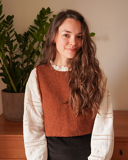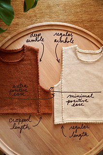 The rust sample is shown in a size 2 with 8 cm / 3.25” of positive ease on a bust of 86 cm / 34.5” in the cropped length and with deep armholes. The cream sample is shown in a size 2 with 2 cm / 0.75” of positive ease on a bust of 86 cm / 34.5” in the regular length and with regular armholes.