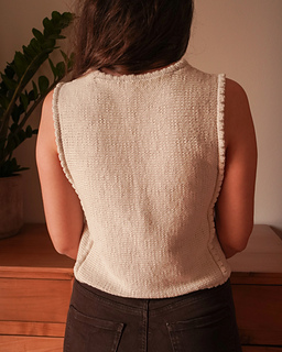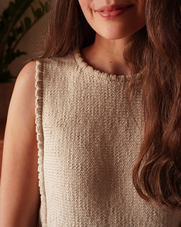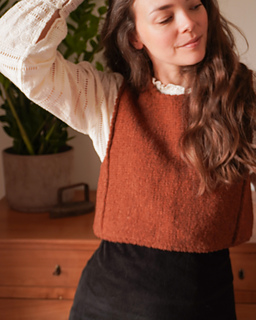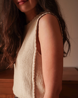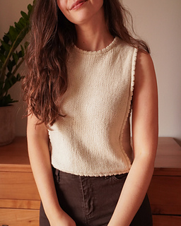 The Petali Slipover is a versatile garment that can be elegantly layered over dresses or blouses for added warmth in a woolen version or worn on its own as a summer top when worked using a plant-based yarn.