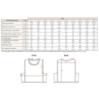 Sizes 1 (2, 3, 4) 5, 6, 7 (8, 9, 10) can be worked to obtain finished bust circumference measurements (A) in the ranges indicated in the finished measurements table. See finished measurements table and schematics at the end of the pattern pictures for more information.