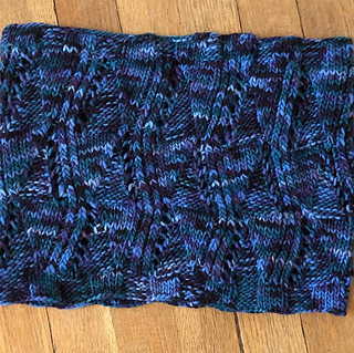 Peyto Lake is a glacier-fed lake in Banff National Park in Alberta, Canada. In the summertime, the lake is fed by Peyto Creek, which drains water from Peyto Glacier. The glacial water contains “rock flour” – fine-grained, silt-sized pieces of bedrock scoured off the mountain by glacial erosion – which is suspended in the water and gives the lake a bright, robin’s egg blue or turquoise colour. The beautiful colour of Peyto Lake and the outline of the surrounding mountain peaks are the inspiration for this cowl.