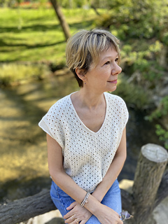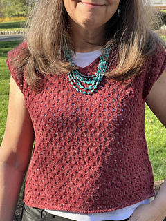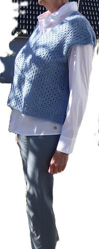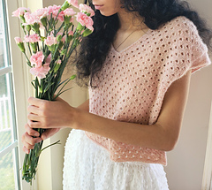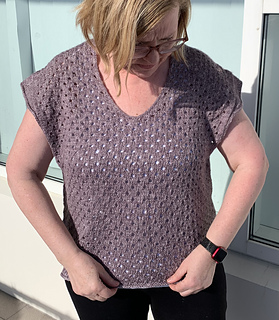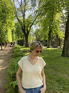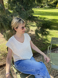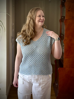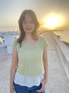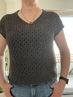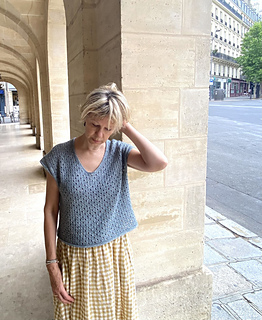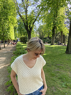 The construction of Phaos is very simple. First, you will work the back with increases for European shoulders and continue down to the underarm. Next, you will work the left side of the front and the right side of the front before joining them with a pretty V-neck (there is an option to work a shallower V-neck) and continuing down to the underarm. After that you will join the front and the back and have the choice between working Phoas straight down from there or working a slightly tapered body. Last you will work minimal cap sleeves as a finishing touch.