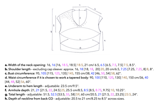 Phaos is designed to be worn with a positive ease of approximately of 10 cm/4”, if worn on its own, to 20 cm/8”, if worn layered over another top or a shirt.