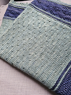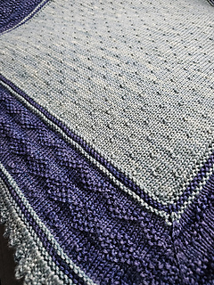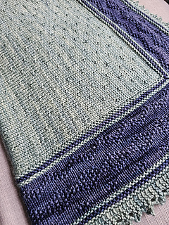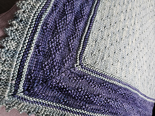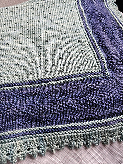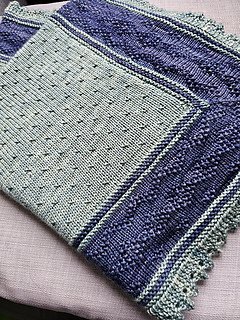 A 2 coloured blanket with both texture and lace elements. A cetral square is worked first with the edges picked up for a seemless knit. The blanket is cast off using a knitted edge.