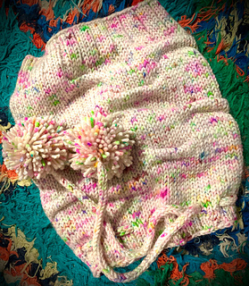 Worked in the round, brim up. The top is closed with a draw string attached to two pom poms.