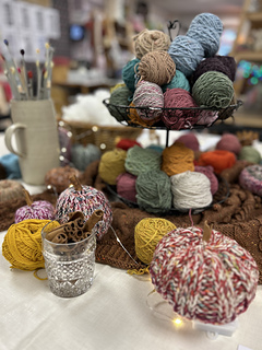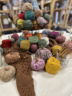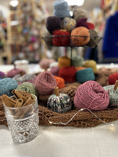 Scrap yarn is great for this project! Aim for about Aran weight yarn or slightly thicker. Combining different colour and weight yarns gives great dimension for the pumpkins, i.e. 3 strands of 4-ply, a strand of 4-ply and DK, two strands of DK etc or variegated/speckled/colour changing Aran weight yarn bring great natural looking results.