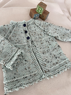 The Picot Cardigan, Hat and Mittens knitting pattern is for a sweet little set that can be knitted in variegated, speckled or solid yarn. The jacket is a simple bottom-up construction with integrated bands. The cardigan sleeves, hat and mittens can be knitted in the round or flat and seamed. All are quick and easy knits in DK weight yarn.