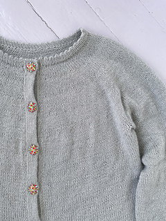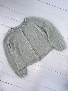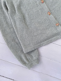 The Picot Cardigan is worked top-down. Picot details create decorative edges at the neckline, body hem, and sleeve cuffs. The cardigan is worked flat. The neckline is worked first, then increases are made across several rows to shape the yoke. Sleeve stitches are put on hold while the body is worked to the desired length and finished with a folded picot edge. The cardigan has balloon sleeves and a picot edge. Finally, stitches are picked up along the front edges to work double-knit button bands.