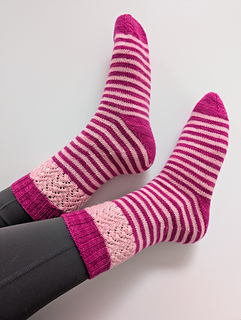 The Piglet Socks are knit using two contrasting colors. The socks are cuff-down, beginning with a 2x2 ribbed cuff. The leg of the sock features a no-purl braided cable and lace design that shows up beautifully in your contrast color. A modified Strong Heel allows the thin, jogless stripes to flow seamlessly down the leg, through the gusset, and into the foot of the sock. The Strong Heel fits slightly looser than a traditional heel flap and gusset, making it perfect for people with high insteps and for children with rapidly growing feet. The cuff, heel, and toe are knit using your main color for a polished, coordinated look. Kitchener stitch is used to finish off the sock.