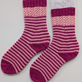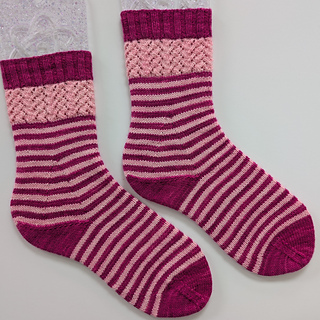 Sample is shown in Practically Perfect Sock by Emma’s Yarn in the colorways Ladies and Magentlemen (MC) and Poppin’ (CC), 80% superwash merino wool/20% nylon, 400 yds (366 m) per 3.5 oz (100 g).