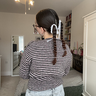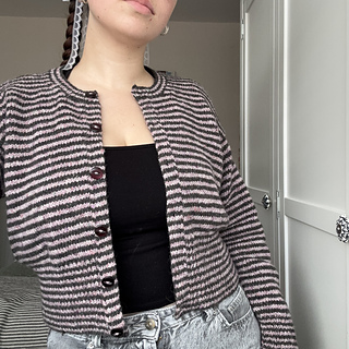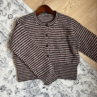 This cropped crew neck cardigan is knit in stockinette stitch with a 2 row stripe repeat. It features a large ribbed waist section, as well as cuffs, with a double knit button band. The stripes continue across all ribbed and double knit sections for a continuous look.