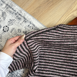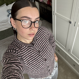 Stitches are picked up along the front edge and a double knit button band is added, continuing the 2 row stripe pattern. The collar is then picked up and knitted above the button band. The sleeves are picked up and knitted in the rounds, with decreases to shape them into a tapered sleeve, with a long ribbed cuff.