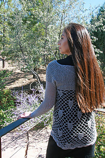 The solid yoke flows seamlessly into an open pineapple lace body, creating a layering piece that’s elegant without adding bulk. Lace weight yarn gives it beautiful drape and breathability, making it as comfortable to wear as it is striking to look at.