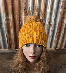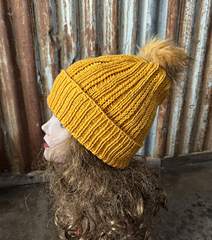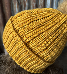 The Pinehurst uses approximately 190 yards of a 4 medium weight yarn. Perfection by Kraemer Yarns, 30% Merino wool/70% acrylic, in the Alligator colorway was used in the beanie sample. Deborah Norville Everyday Yarn, 100% acrylic, in the Mustard colorway was used in the winter hat sample.
