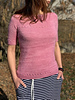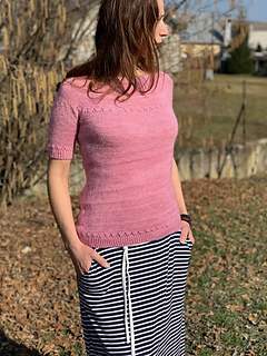 Pink Lady is a top-down circular yoke top with fine lace, twisted ribbing and short sleeves.