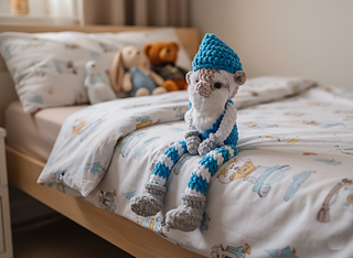 The plush chenille yarn gives him a soft, cozy look, while the long legs and striped hat add charm without complicated shaping. Stuff the pieces gradually so they keep a smooth and even shape.