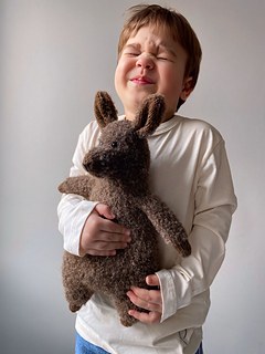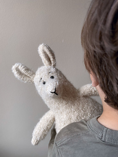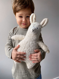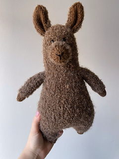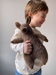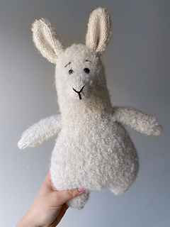 The alpaca is worked in the round from the bottom up as one continuous piece, starting from the legs and ending at the head. The arms are made separately and joined to the body as you go. The ears and nose are knitted separately and sewn on. The nose is embroidered with black yarn.