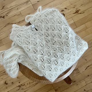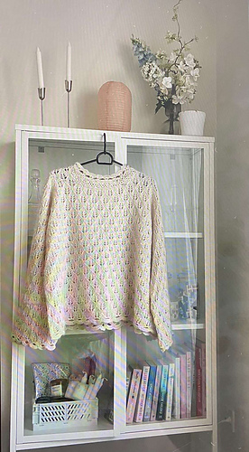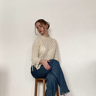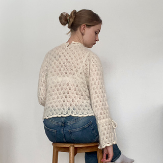 Blusen er konstrueret nedefra og op, hvilket giver dig god kontrol over længden på både krop og ærmer undervejs. Som en unik designdetalje afsluttes blusen med hæklede kanter, der giver et skarpt og moderne udtryk, som man sjældent ser i klassisk håndstrik.