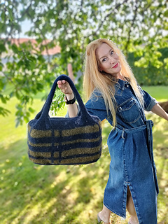 The shown bag operates with two colors. MC is blue, CC is green. Both Knoll Kilcarra held double. But it is only the knitter who decides. Consider the bag as a canvas where you paint with the leftover yarn you have