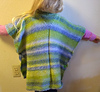 A fun poncho knit in one piece. Using self striping worsted or aran weight yarn, this knits up quick. I made this for my 7 year old granddaughter, and her 5 year old sister wears it too. This is not a fitted item, so it will fit children from approximately 4 to 9 years old, and could easily be resized.