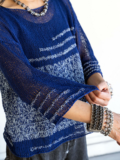 The top is worked with two strands of main color held together throughout, and a contrast color is added in some sections. Those sections are worked with three strands of yarn held together, providing more structure and less of a sheer fabric for contrast.