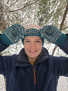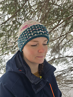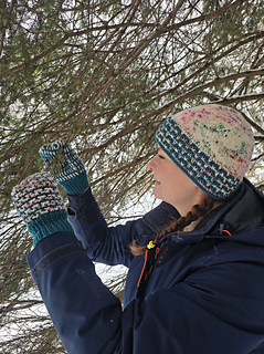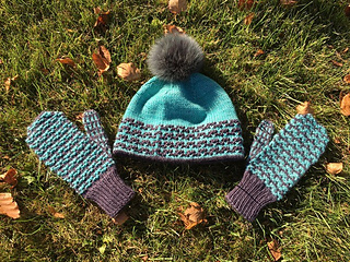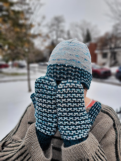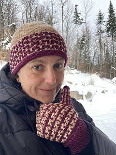 Platysma duo est un ensemble tuque/mitaines utilisant 2 couleurs de laine grosseur DK. C’est une belle collaboration avec Entre Soeurs et Laine pour le marché de Noël Allemand! Cet ensemble se tricote en mosaïque, donc on tricote toujours avec un seul brin de fil à la fois. Le rebord double replié de la tuque est parfait pour garder les oreilles au chaud!