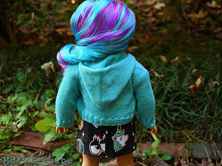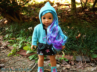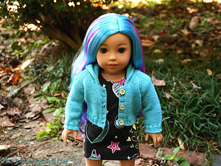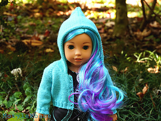 Cardigan fits American Girl Doll and similar sized 18 inch dolls. Cardigan has raglan shaping, long sleeves, hood, and working button bands with buttons.