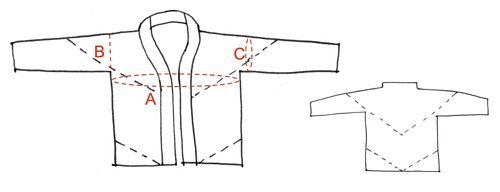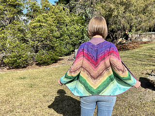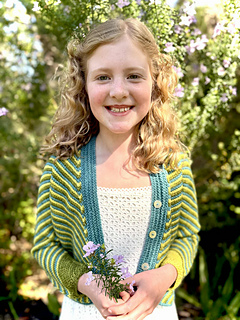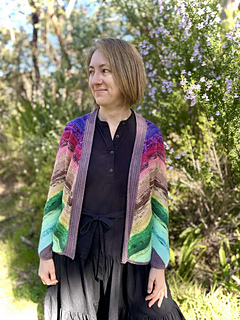 The start of a shawl can become a garment. This cardigan starts at the back of the neck as an isosceles triangle. Additional triangles are added to form a shape that will drape over the shoulders. Once the yoke measurements are achieved, sleeve and torso lengths are added, and the cardigan base becomes chevron. The base is squared off on both torso and sleeves and a ribbed band is added at the end for added texture and buttons, if desired.