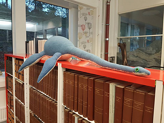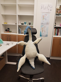 This pattern is based on a real plesiosaur fossil (alive along side the dinosaurs) described by a good friend and colleague. To make this plesiosaur come life the Paleo-artist Esther van Hulsen made a beautiful reconstruction on paper. The colors are taken from this image. If you wish to see more of her work find her on Facebook.