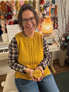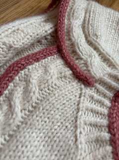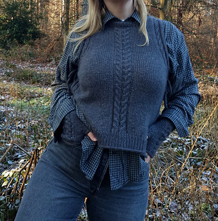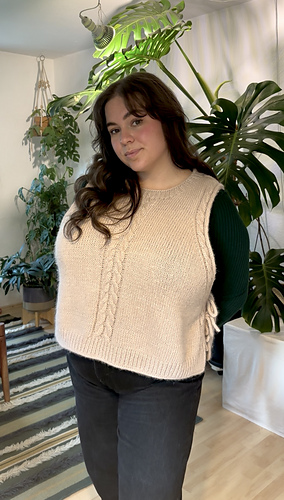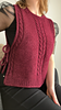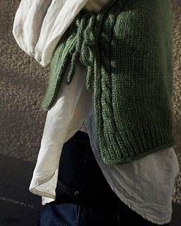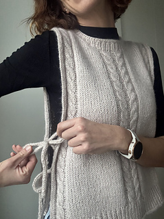 It is knitted top down, starting with the back piece. Then, sts are picked up for the shoulders and the front piece is worked. The neckline is worked in 1x1 rib and finished with an i-cord bind off. Finally, 8 i-cord strings are worked and attached to the sides of the slipover to be tied into bows.