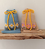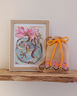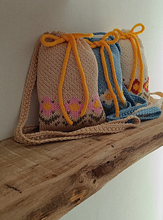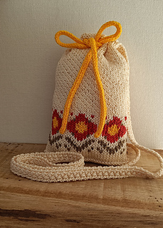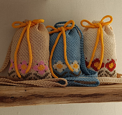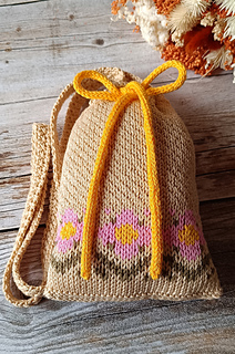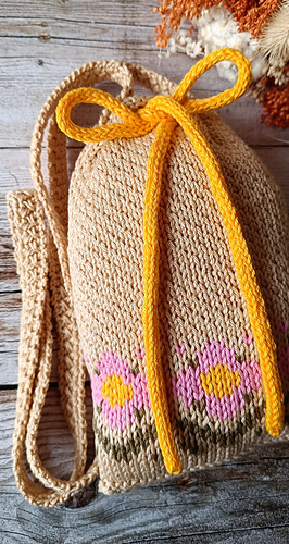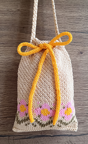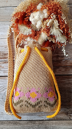 Cette pochette se tricote en rond en commençant par le fond avec un montage provisoire. Sa partie basse présente un motif floral en jacquard. La bandoulière, quant à elle, est crochetée.