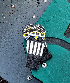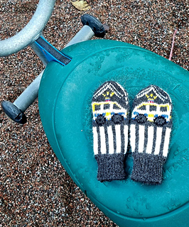 TIP: If you find it difficult to knit with many colors at the same time, you can embroider the black, yellow, blue and red on the police car with duplicate stitches. Photo instructions included