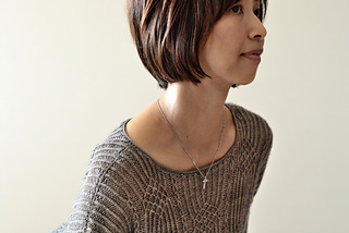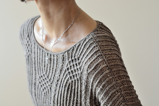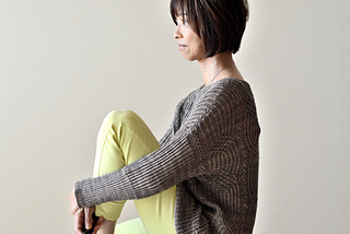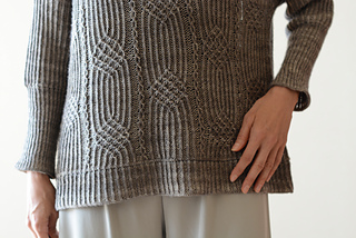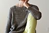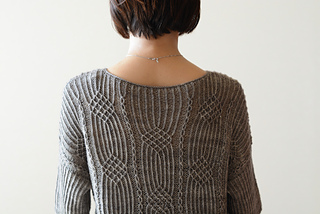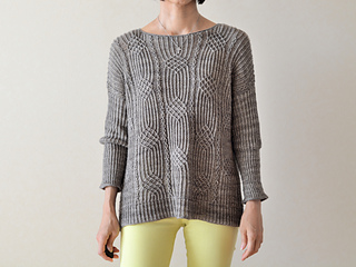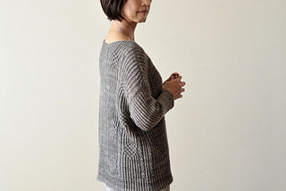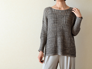 First, two I-cords are knit and stitches are picked up for the back and front along the I-cord edges. German short rows are used to shape the shoulders in 1x2 twisted rib, then the front and back of the pullover are worked back and forth separately to the underarm with smoking pattern. They are then joined and worked in the round in one piece to the hem. The sleeves are worked top down in the round in 1x2 twisted rib, and the cuffs are worked in 1x1 twisted rib. The body and sleeves feature a lateral braid as an accent.