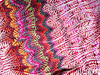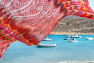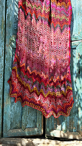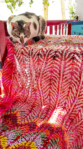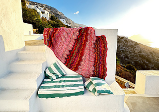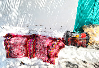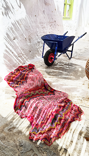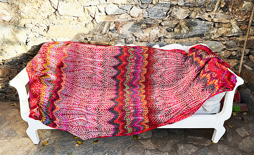 A giant shawl (or small blanket) with graceful lines and an enveloping warmth. The pattern is inspired by stylized pomegranates and the color distribution is influenced by ikat and tie-dyed textiles.