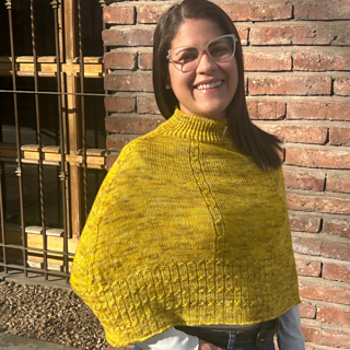 (ESP) El Poncho Radiante es un diseño tejido de arriba hacia abajo, con un cuello elástico y cierre italiano que da inicio a una construcción sencilla y práctica. Su forma se logra gracias a una línea de aumentos en los hombros, creando la caída fluida característica de un poncho. Como detalle especial, incorpora un tejido en forma de trencita, que aporta delicadeza y movimiento.