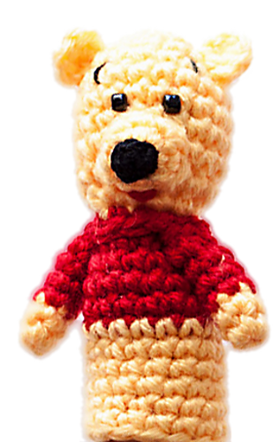 Pooh Bear is based on a famous character property of © Disney, which means that all copyrights are reserved to its distribution and reproduction. This Bear has a very common construction for an amigurumi, it is based on head, crocheting in rounds, one unit with changes of colors from head to body, two sewn ears, two sewn arms and a few features that enhance details. Size is expected approx. 3 inches and it is designed for index finger or middle.