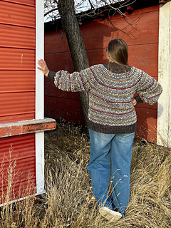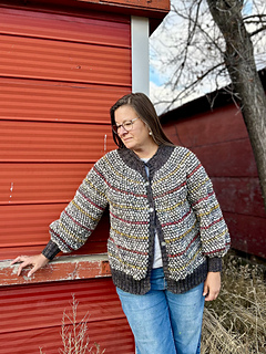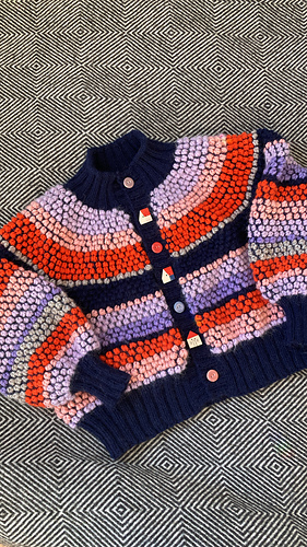 玉編みのように立体的なポップコーン模様を使ったカーディガンです. Fingering weight (ソックヤーンの太さ) の糸を2色使って編みます. 3本取りの糸で編む段と1本取りの糸で編む段を2段ずつ交互に編むことで立体的な模様が簡単に出来上がります. 1玉の毛糸から3本の糸を作りながら編み進めるので, 毛糸を3玉用意しなくても3本取りで編むことができます.