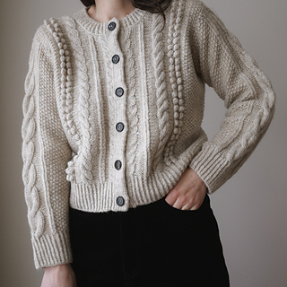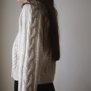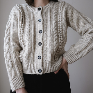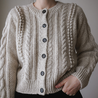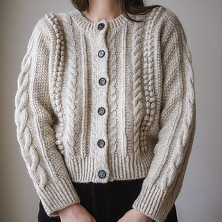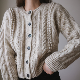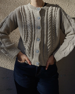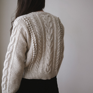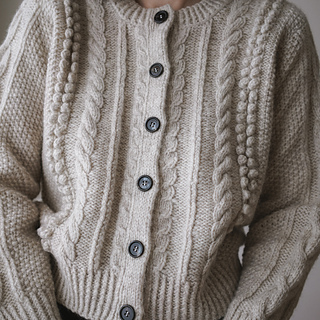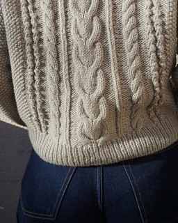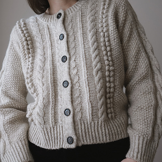 The saddle shoulders are worked first and feature a stockinette section that transitions into a striking cable, flowing seamlessly from the shoulder down the sleeve. The Back and Front are then worked by picking up stitches along the saddle shoulders.The central panel combines a series of fine, intricate cables and bobbles, adding depth and refinement. Designed with a traditional silhouette and a round neckline accented by a subtle decorative line, the Poppea cardigan balances classic sophistication with modern ease.