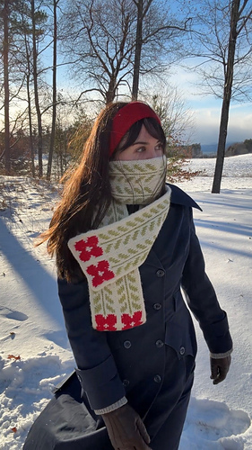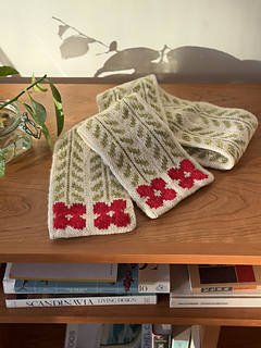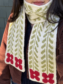 The Poppy Scarf’s meant to feel like a looong bouquet of springtime wildflowers that won’t wilt even in the cold winter months. It’s knit in the round using stranded colorwork, which makes it extra cozy-thick and also double sided!
